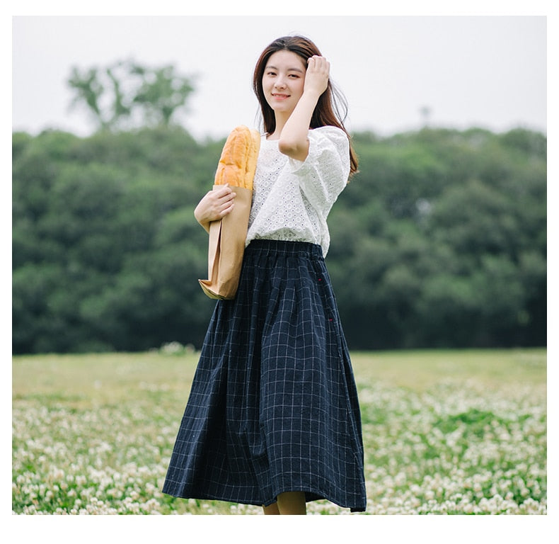 Fannic Retro plaid pocket Elastic waist pocket loose A-Line skirt mori girl spring